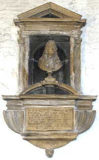 A mural monument to Sir John Berry exists in St Dunstan's Church, Stepney, London, on the north wall, which he ordered to be erected at a cost of no less than £150. Prince described the monument thus:[10] "It is all of white marble of about 10 foot in height and 5 in breadth finely polished. In a nich in the middle stands on a pedestal the effigies[11] of Sir John cut with a campaign wig and a cravat in pure alabaster. Over his head are the arms of his family, underneath on a table of white marble is the following epitaph in black letters:[12]