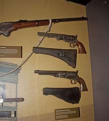 John Wilkes Booth slipped into Lincoln's box that evening at around 10 p.m. as the play progressed and shot the President in the back of the head with a .41 caliber Deringer.[108] Booth's escape was almost thwarted by Major Henry Rathbone, who was present in the Presidential box with Mrs. Mary Todd Lincoln.[109] Booth stabbed Rathbone when the startled officer lunged at him.[86] Rathbone's fiancée Clara Harris was also present in the box but was unhurt.