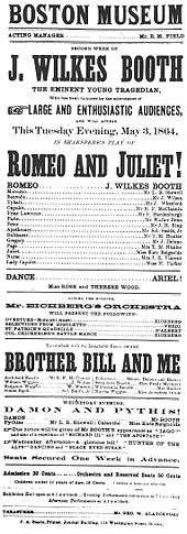 On November 25, 1864, Booth performed for the only time with his brothers Edwin and Junius in a single engagement production of Julius Caesar at the Winter Garden Theatre in New York.[61] He played Mark Antony and his brother Edwin had the larger role of Brutus in a performance acclaimed as "the greatest theatrical event in New York history."[60] The proceeds went towards a statue of William Shakespeare for Central Park which still stands today.[61][62] In January 1865, he acted in Shakespeare's Romeo and Juliet in Washington, again garnering rave reviews. The National Intelligencer said of Booth's Romeo, "the most satisfactory of all renderings of that fine character," especially praising the death scene.[63] Booth made the final appearance of his acting career at Ford's on March 18, 1865, when he again played Duke Pescara in The Apostate.[64][65]