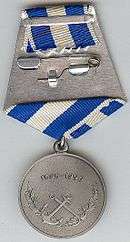 The medal is suspended by a ring through the award's suspension loop to a standard Russian pentagonal mount covered with an overlapping 24 mm wide white silk moiré ribbon with two 7 mm wide blue stripes located 1 mm from the ribbon's edges.[1]