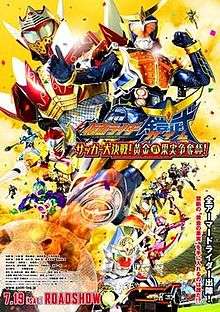 Kamen Rider Gaim the Movie: Great Soccer Battle! Golden Fruits Cup! (劇場版 仮面ライダー鎧武 サッカー大決戦!黄金の果実争奪杯(カップ)! Gekijōban Kamen Raidā Gaimu Sakkā Daikessen! Ōgon no Kajitsu Sōdatsu Kappu!) is a 2014 Japanese film, serving as the film adaptation of the 2013-2014 Kamen Rider Series television series Kamen Rider Gaim. It was released on July 19, 2014, in a double billing with Ressha Sentai ToQger the Movie: Galaxy Line S.O.S..[1] Nitroplus writer Jin Haganeya wrote the script[2] which features the heroes and villains of Kamen Rider Gaim entering an alternate world where instead of forming dance troupes, they play soccer. The film features cameo appearances by J. League soccer players and guest stars Kataoka Ainosuke VI as the film's antagonist Kogane.[3][4]