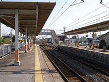 This station consists of two opposed side platforms serving two tracks, connected to the station building by an overhead passageway.