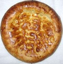 The introduction of flour to Kazakh cuisine brought about dishes such as baursak, shelpek, manti, and nan. Baursak is made by frying dough balls, and shelpek is a flat cake made in a similar fashion.[7] Manti, a very popular Kazakh dish, is a spiced mixture of ground lamb (or beef) spiced with black pepper, enclosed in a dough wrapper. Manti are cooked in a multi-level steamer and served topped with butter, sour cream, or onion sauce. Tandyr nan is a type of traditional bread made in the tandoor oven, popular in cities along the Silk Way. Kuimak, kattama, and oima are flat puff cakes fried in oil then covered in cream.