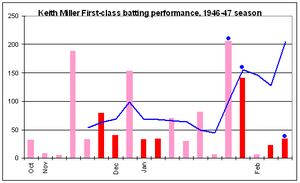 Overall, Miller played in 13 first-class matches during the Australian summer, scoring 1,202 runs at 75.12 and taking 32 wickets at 22.65.[15] In matches for Victoria, where he played under Hassett's captaincy, Miller scored 713 runs at 89.13 and took 14 wickets at 21.14.[15] In all, he took 14 catches.[15] Of the six matches in the victorious Sheffield Shield campaign, five were won and the other was drawn, Miller averaging 133.40.[73]