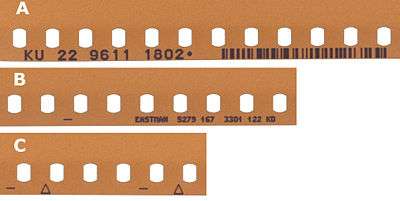 Visible ink is sometimes utilized to imprint on the edge of the film - again in manufacturing - at the time of perforations. The ink, which is not affected by photographic chemicals, is normally printed onto the base surface of the film. The numbers are visible on both the raw stock (unexposed) and processed (exposed and developed) film. This method is primarily utilized for black & white negative film.