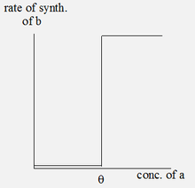 There is little effect of a, until it reaches a threshold concentration theta, and at higher concentrations a plateau is reached which shows the maximal rate of synthesis of b. Such a nonlinear, bounded curve is called a sigmoid. It can be suggested that a is "absent" for a < theta and "present" for a > theta. The sigmoid curve can be approximated by the step function, as in figure C.