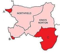 - ↑ Those parts of the former Urban District of King's Norton and Northfield taken into Birmingham are now represented by the City's modern residential suburban districts of Bartley Green, Bournbrook, Bournville, Brandwood End, California, Cotteridge, Druid's Heath, Hawkesley, Highter's Heath, King's Heath, King's Norton, Kitwell, Lifford, Longbridge, Moor Green, Moseley, Northfield, Rednal (part of), Rubery (part of), Selly Oak, Selly Park, Shenley, Stirchley, Ten Acres, Turves Green, Wake Green (part of), Warstock, Weoley Castle, Weoley Hill, West Heath, and Woodgate.