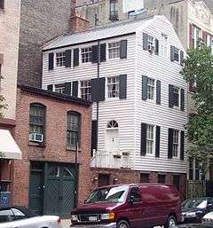 A single survivor of the late 18th or early 19th century in the neighborhood is the simple vernacular white clapboard house, much rebuilt, at 203 East 29th Street. The house, standing gable-end to the street, is one of a mere handful of wooden houses that remain on Manhattan Island. Its date of construction is unknown[8] but has been variously dated from around 1790[9] to as late as 1870;[2] currently listed on the National Register of Historic Places, the house is privately owned and not open to the public.