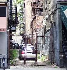 The neighborhood has been rebuilt in patches, so one can see both new high-rise structures often set back from the street, and a multitude of exposed party walls that were never meant to be seen in public. Nearly forgotten feature is the private alley called Broadway Alley, between 26th and 27th Streets, halfway between Lexington and Third Avenues, reputedly the last unpaved street in Manhattan;[16][17] it is not known what this alley is named after, since it is not near the main Broadway.[15]
