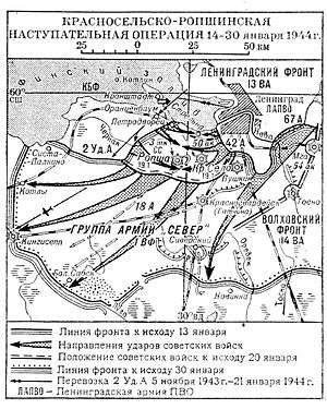 Fedyuninsky's 2nd Shock Army and General Ivan Maslennikov's 42nd Army fell on the sector of Obergruppenführer Felix Steiner's III (Germanic) SS Panzer Corps, hitting the area of the 9th and 10th Luftwaffe Field Divisions. By the third day of the offensive, the 2nd Shock Army broke through the German lines with a penetration 23 kilometers wide.[2] The Luftwaffe units crumbled quickly, and the Army Group North fell back to new positions along the Narva river in Estonia.[4] In a key Soviet assault on January 19, the 63rd Guards Rifle Division seized German positions to the front of Krasnoye Selo.[4] On January 19, the 2nd Shock Army took Ropša and the 42nd Army liberated Krasnoye Selo.