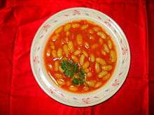 Kuru fasulye is a stewed bean dish in Turkish cuisine.[1][2] It is made primarily with white beans and olive oil, and onion and tomato paste are almost invariably used. Sometimes other vegetables or meat may also be added. Kuru fasulye is often served along with rice or bulgur. It is often considered the national dish of Turkey.[3][4]