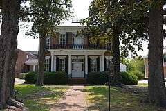 The original Kyle House, home to merchant James Kyle, burned in a city fire in 1831.[2] Rumor had it that the great fire began in the Kyle House's kitchen.[3] It was then rebuilt in about 1855 as a two-story, five bay, brick town house with Greek Revival and Italianate style design elements. It features a three bay wide one-story porch with a flat roof supported by four fluted Doric order columns.[4]