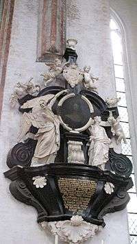 In the renaissance and baroque periods, the church space contained so many memorials that it became like a hall of fame of the Lübeck gentry.[10] Memorials in the main nave, allowed from 1693, had to be made of wood, for structural reasons, but those in the side naves could also be made of marble. Of the 84 memorials that were still extant in the 20th century, almost all of the wooden ones were destroyed by the air raid of 1942, but 17, mostly stone ones on the walls of the side naves survived, some heavily damaged. Since these were mostly baroque works, they were deliberately ignored in the first phase of reconstruction, restoration beginning in 1973. They give an impression of how richly St. Mary's church was once furnished. The oldest is that of Hermann von Dorne, a mayor who died in 1594, a heraldic design with mediaeval echoes. The memorial to Johann Füchting, a former councillor and Hanseatic merchant who died in 1637, is a Dutch work of the transitional period between the Renaissance and Baroque times by the sculptor Aris Claeszon who worked in Amsterdam. After the phase of exuberant cartilage baroque, the examples of which were all destroyed by fire, Thomas Quellinus introduced a new type of memorial to Lübeck and created memorials in the dramatic style of Flemish High Baroque for