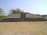 Located south of the square, its rectangular base is 52 by 36 m; it is large and its construction is based on overlaid and stepped platforms. On top has a rectangular temple, inside has several circles. Access is by several broad stairs ornamented by four cubes. The steps have different heights: the first are significantly higher than the others.