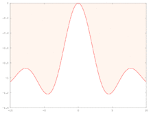 The function e(x), in blue, is shown on top for M = 0.5, and at the bottom for M = 3. Here, ƒ(x) = sin x/x, with a global maximum at x0 = 0. It is seen that as M grows larger, the approximation of this function by a Gaussian function (shown in red) is getting better. This observation underlies Laplace's method.