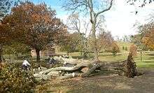 The 2007 Brooklyn tornado hit this area, specifically 68th Street and Bay Ridge Avenue between Third and Fourth Avenues.[13] Eleven houses had to be vacated after they suffered significant damage, and many of the trees on the two blocks toppled, landing on cars and stoops. The 4th Avenue Presbyterian Church had its very large stained glass window blown out.[14] As the tornado lifted, it peeled the roof of a nearby Nissan dealership and deforested 40% of Leif Ericson Park. The tornado has been rated an EF-2 on the Enhanced Fujita scale, with winds between 111 and 135 MPH.[15]
