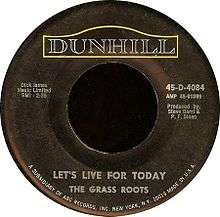 "Let's Live for Today" is a song written by David Shapiro, Ivan Mogul, and Michael Julien, and initially recorded by the English band The Rokes in 1966.[1] The song was later popularized by the American rock band The Grass Roots,[1] who released it as a single on May 13, 1967.[2] The Grass Roots' version climbed to #8 on the Billboard Hot 100 singles chart, eventually selling over two million copies and being awarded a gold disc.[1][3][4] The song was also included, as the title track, on The Grass Roots' second album, Let's Live for Today.[5] Since its initial release, The Grass Roots' rendition of the song has become a staple of Oldies radio programming in America and is today widely regarded as a 1960s classic.[6]