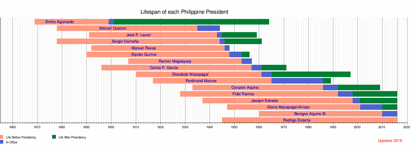 This is a graphical timeline of the lifespans of Presidents of the Philippines. The presidents are listed in order of office.[1][2][3]