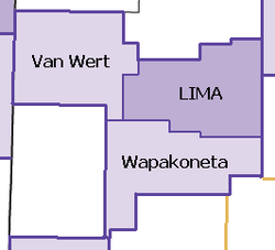The Lima–Van Wert–Wapakoneta Combined Statistical Area (CSA) is made up of three counties in Northwest Ohio. The Lima Metropolitan Statistical Area and two Micropolitan Statistical Areas – Van Wert and Wapakoneta, are components of the CSA. As of the 2000 Census, the CSA had a population of 184,743 (though a July 1, 2009 estimate placed the population at 179,552).[1]