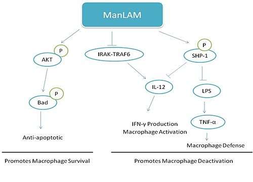 Other models suggest that ManLAM acts to mediate immunosuppressive effects through suppression of LPS-induced IL-12 p40 protein production. ManLAM is thought to inhibit the IL-1 receptor-associated kinase (IRAK)-TRAF6 interaction, IκB-α phosphorylation, and nuclear translocation of c-Rel and p50 which causes reduced IL-12 p40 production.[10]