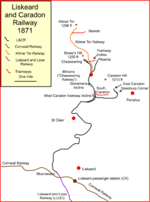 The Liskeard and Caradon Railway was a mineral railway in Cornwall, in the United Kingdom, which opened in 1844. It was built to carry the ores of copper and tin, and also granite, from their sources on Caradon Hill down to Moorswater for onward transport to market by way of Looe Harbour and coastal shipping. At first this was on the Liskeard and Looe Union Canal and later on the parallel Liskeard and Looe Railway.