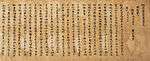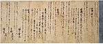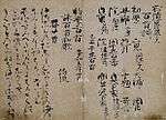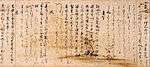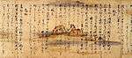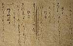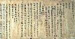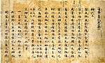 The 984 Sanbō Ekotoba ("The three jewels" or "Tale of the three brothers" or "Notes on the pictures of the three jewels"), was written by Minamoto no Tamenori in Chinese for the amusement of a young tonsured princess.[102][103][104] It is a collection of Buddhist tales and a guide to important Buddhist ceremonies and figures in Japanese Buddhist history.[105][106] The designated manuscript from 1273 is known as the Tōji Kanchiin[nb 12] manuscript and is the second oldest of the Sanbō Ekotoba. It is virtually complete unlike the late Heian period (Tōdaiji-gire) which is a scattered assortment of fragments.[107]