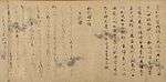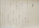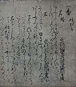 | Ten Varieties of Waka Style (和歌躰十種 Wakatai jisshu)[80] | Possibly Fujiwara no Tadaie[nb 6] | Discussion of the ten waka styles with five examples written in hiragana each; also named "Ten Styles of Tadamine" after the purported author of the 945 original work, Mibu no Tadamine; oldest extant manuscript of this work | Heian period, circa 1000 | One scroll, ink on decorative paper, 26.0 cm × 324.0 cm (10.2 in × 127.6 in); one hanging scroll (fragment of a book), ink on decorative paper, 26.0 cm × 13.4 cm (10.2 in × 5.3 in) | Tokyo National Museum, Tokyo | ![]() |