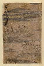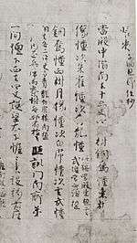 The cultural interaction between Japan and China is exemplified by the Wakan Rōeishū, a collection of 234 Chinese poems, 353 poems written in Chinese by Japanese poets (kanshi) and 216 waka, all arranged by topic.[108][109][110] Compiled in the early 11th century by Fujiwara no Kintō, it was the first and most successful work of this genre.[111][112][113] The English title, "Japanese-Chinese Recitation Collection" indicates that the poems in this collection were meant to be sung.[111][112][113] The Wakan Rōeishū has been valued as a source for poetry recitation, waka composition and for its calligraphy, as it displayed kana and kanji.[109][114] Three manuscripts of the Wakan Rōeishū written on decorated paper have been designated as National Treasures: the two scrolls at the Kyoto National Museum contain a complete transcription of the work and are a rare and fully developed example of calligraphy on an ashide-e[nb 13] ground;[115] the Konoe edition at Yōmei Bunko is a beautiful example of karakami[nb 14] with five-colored design (saisen);[116] and the Ōtagire is written on dyed paper decorated with gold drawings.[117][118]