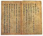 The Konjaku Monogatarishū from ca. 1120 is the most important setsuwa compilation.[119][120] It is an anonymous collection of more than 1,000 anecdotes or tales.[121][122] About two-thirds of the tales are Buddhist, telling about the spread of Buddhism from India via China to Japan.[119][121] As such it is the first world history of Buddhism written in Japanese.[121] This National Treasure is also known as the Suzuka Manuscript and consists of nine volumes[nb 15] covering setsuwa from India (vols. 2 and 5), China (vols. 7, 9, 10) and Japan (vols. 12, 17, 27, 29).[4][121] It is considered to be the oldest extant manuscript of the Konjaku Monogatarishū and has served as a source for various later manuscripts.[123][124]