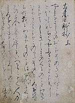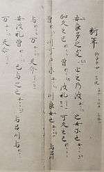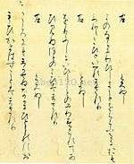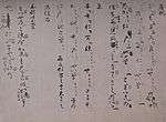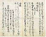 One of the earliest kana materials and one of the oldest extant works of Japanese prose fiction is the Tosa Diary written by Ki no Tsurayuki in 935.[92][93][94] It is also the oldest Japanese travel diary, giving an account of a return journey to Kyoto after a four-year term as prefect of Tosa Province.[95][96][97] The diary consists of close to 60 poems,[nb 10] connected by prose sections that detail the circumstances and the inspiration for the composition of the poems.[24][98][99] The work has been valued as a model for composition in the Japanese style.[100] The original manuscript by Ki no Tsurayuki had been stored at Rengeō-in palace library, and later was in the possession of Ashikaga Yoshimasa, after which its trace is lost.[6] All surviving manuscripts of the Tosa Diary are copies of this Rengeō-in manuscript.[101] The oldest extant of these, by Fujiwara no Teika, dates to 1235. One year later his son, Fujiwara no Tameie, produced another copy based on the original. Both transcriptions are complete facsimiles of the original, inclusive of the text, the layout, orthographical usages, and calligraphy.[nb 11][101] They have been designated as National Treasures.[4]