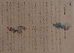 | Collected Japanese Poems of Ancient and Modern Times (古今和歌集 Kokin Wakashū), Gen'ei edition[72][73] | possibly Fujiwara no Sadazane, grandson of Fujiwara no Yukinari | Oldest complete manuscript of the Kokin Wakashū | Heian period, July 24, 1120 | Two bound books, ink on decorative paper, 21.1 cm × 15.5 cm (8.3 in × 6.1 in) | Tokyo National Museum, Tokyo | ![]() |