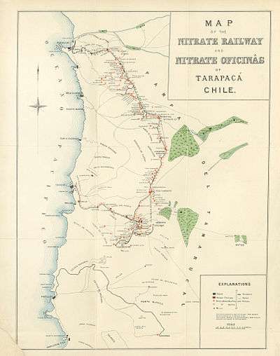 This is a list of the Saltpeter Works in Tarapacá and Antofagasta regions. The information regarding Saltpeter works on this page is compiled from the data supplied by the National Geospatial-Intelligence Agency, Country Files (GNS).[3] Unique Feature Identifier (UFI) is a number which uniquely identifies a Geoname feature. Same UFI means same feature.