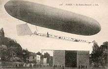 - No. 5 (airship) — Built to make an attempt on the Deutsch de la Meurthe prize for a flight from the Aero-Club de France's flying field at Saint-Cloud to the Eiffel Tower and back within 30 minutes. Used the enlarged envelope from No. 4, from which an elongated triangular-section gondola made of pine was suspended. Other innovations included the use of piano wire to suspend the gondola, greatly reducing drag and the inclusion of water ballast tanks. Powered by a 12 hp 4-cylinder inline air-cooled engine driving a pusher propeller.[8] First flown on 11 July 1901: a lengthy flight was made the next day and an attempt on the de la Meurth prize on the 13th: the outward flight was accomplished in ten minutes, but the return was hampered by a headwind and took half an hour. On reaching St Cloud the engine failed and the arship was blown into the surrounding trees, damaging the envelope. A second attempt on the prize was made on 8 August but ended in disaster: after reaching the Tower in eight minutes, the airship began losing hydrogen because of a faulty valve. The partial deflation of the envelope caused some of the suspension wires to foul the propeller: Santo-Dumont therefore stopped the engine leaving the craft not only unpowered but without any means of inflating the ballonet to maintain the shape of the envelope. Helpless, the craft was blown back towards the Tower and blown onto the roof of the Trocadero Hotel, bursting the envelope with a noise described in some press reports an explosion but which Santos-Dumont likens to a paper bag being burst. Santos-Dumont was left precariously suspended above the courtyard of the hotel, but was rescued by the Paris fire brigade. The airship was damaged beyond repair: only the engine was salvaged.[9]