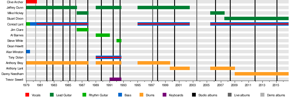 The following is a complete chronology of the various line-ups of British extreme metal band Venom, formed in 1979. The group evolved out of an older group, Guillotine, formed in 1978. No individual has consistently remained with the group throughout its entire career; vocalist and bassist Conrad Lant, a co-founding member, fronts the group today.