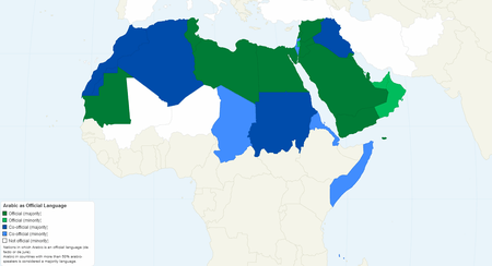 Nations in which Arabic is an official language (de facto or de jure). Arabic in countries with more than 50% Arabic-speakers is considered a majority language, otherwise it is a minority language.