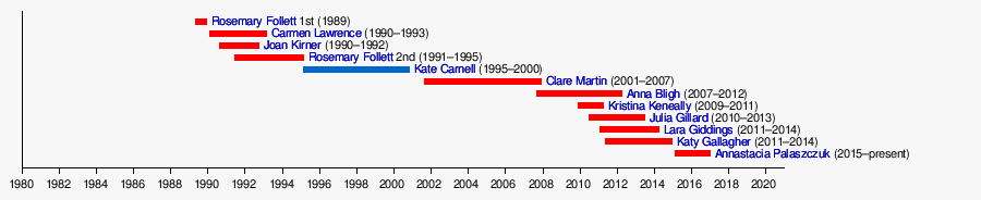 4 years, 112 days | Labor | Appointed 1st Chief Minister of the Australian Capital Territory in May 1989. Defeated in a vote-of-no-confidence in December 1989, to Trevor Kaine. Returned to power in June 1991, following a vote-of-no-confidence against Kaine. Led Labor to victory at the 1992 general election. Defeated by the Liberals under Kate Carnell at the 1995 general election. First woman to become Chief Minister of a Territory of the Commonwealth of Australia. Only female government head to serve non-consecutive terms.[1] | |