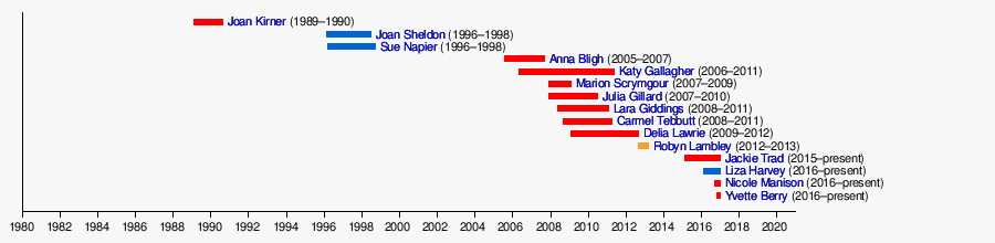 | Nicole Manison | Northern Territory | Labor | Michael Gunner | 12 September 2016 | Incumbent | 87 days |