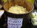 Finely cut cabbage that has been fermented by various lactic acid bacteria, including Leuconostoc, Lactobacillus, and Pediococcus.[16][17] It has a long shelf life and a distinctive sour flavor, both of which result from the lactic acid that forms when the bacteria ferment the sugars in the cabbage. | ||