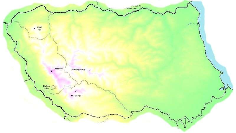 Topographically, the boundaries of the North Pennines trace the flow of streams from the lowest points between it and the neighbouring regions of the Lake District, Cheviots and Yorkshire Dales. This gives the boundaries as, primarily, the River Eden, River Tyne, River Tees and River Greta (from Stainmore Gap). This list therefore includes all hills to the east of the North Pennines including the low hills of County Durham.
