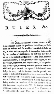 - ↑ Rules and regulations of the Worcester Associate Library Company. 1793