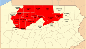 Twenty other Pennsylvania counties today contain land that was once part of Lycoming County: five were formed completely from it (Jefferson, McKean, Potter, Tioga, and Sullivan), eight were formed from it and other counties (Armstrong, Bradford, Centre, Clearfield, Clinton, Indiana, Venango, and Warren), three were formed from counties that were themselves formed partly from it (Cameron, Clarion, and Elk), Forest was formed from a county that was formed completely from it, two (Luzerne and Wyoming) contain territory that was part of lycoming County in 1795, and finally Union received a township from it in 1861.[8][9]