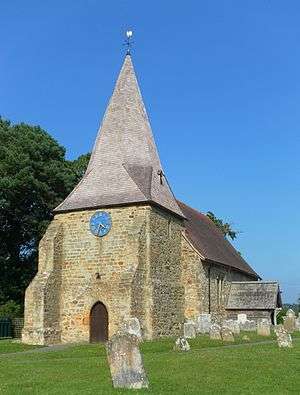 Sussex—the Kingdom of the South Saxons—was one of the last parts of England to be Christianised. It was isolated from other parts of the country because of the thick forest that covered it. When St Wilfrid and his missionaries brought Christianity to the area in the 7th century, they arrived by sea.[3] The new religion quickly spread; the longest established churches in the present Rother area are apparently St Peter's Church in Bexhill's old town and All Saints Church at Icklesham, both founded in 772 (but no 8th-century fabric remains at either location).[4][5] Many more churches were built in the Saxon era, but most were either superseded by larger Norman buildings between the 11th and 13th centuries—as at Sedlescombe[6] and Whatlington[5]—or substantially added to, as at Icklesham.[7] Many places also gained their first church during this period, and the size and opulence of some (such as Ticehurst[8] and Salehurst)[9] reflect the area's iron-industry wealth at the time.[8] Nevertheless, some parishes were initially very large: for example, both Bodiam and Etchingham were served from Salehurst parish church until their own churches were built in the 14th century.[10][11]