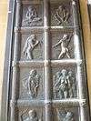 The Offerings of Peace | Gilbert Bayes | Art Gallery of New South Wales 33°52′07″S 151°13′00″E / 33.868733°S 151.216766°E | Companion piece to Offerings of War outside the Gallery.[58] The models for the works are the Elgin Marbles, and the rider carrys Greek theatre masks of Tragedy and Comedy, representing "the arts" and "plenty".[59] The inscription on the base reads: