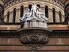 Lady of Commerce | James White | 56 Pitt Street | Bronze sculpture 15 feet 6 inches in height outside the Royal Exchange Building, formerly on the roof of the now demolished stock exchange building.[41][42] The sculpture was regarded as marking "a new development in the history of Sculptural art in Australia" and was made "in the manner of" the statue of "Liberty" in New York. "Commerce is represented by an ideal female figure standing upon the globe on either side of which are placed emblems of the staple industries of the State — sheaves of wheat, miners' tools, ram's head and skin, and an anchor — and holding in her left hand the Caduceus of Mercury, the accepted symbol of commerce, and in her right, a branch of laurel."[43] |