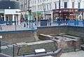 Built of brick in the 14th century, with 4 main gates and up to 30 towers, the walls were maintained until the early 1700s. They were demolished during the building of the docks, beginning in the 1770s.[48] | |