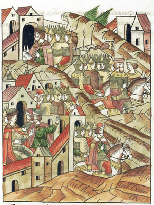 The raids were not mentioned by the early Lithuanian Chronicles. The Bychowiec Chronicle, a late and generally unreliable source, introduced the war to Lithuanian historiography. The chronicle merged the three raids into one and added a colorful exchange of threats between Algirdas and Dmitry Donskoy.[8] In one of the threats, Algirdas promises to kiss Dmitry with his spear and to rest his spear against the Kremlin's Wall. Algirdas then invades the Grand Duchy of Moscow and Dmitry Donskoy sues for peace offering a large ransom. Algirdas accepts but, just as he promised, rests his spear against the Kremlin's Wall. The poetic visual was repeated by Maciej Stryjkowski, Albert Wijuk Kojałowicz and later historians with various modifications.[8]