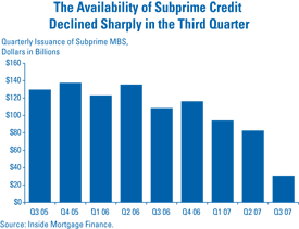 The complexity of many mortgage-backed securitization structures has heightened the overall risk aversion of investors, resulting in what has become a broader illiquidity in global credit markets. These disruptions have led to a precipitous decline in sub-prime lending, a significant reduction in the availability of Alt-A loans, and higher interest rates on jumbo loans (see Chart 3). The tightening in mortgage credit has placed further downward pressure on home sales and home prices, a situation that now could derail the U.S. economic expansion.[6]