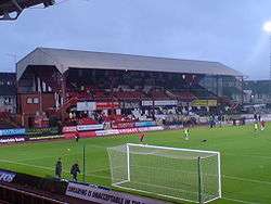 With the Scottish Football Association (SFA) preferring to redevelop Hampden Park, St Mirren remained at Love Street and seats were installed on the North Bank terrace in 1991.[1] Four years later, after the owner of a large building company had joined the club's board of directors, the 3,015 seat Caledonia Stand was built in a deal that saw some of the club’s land sold for development as housing.[1] There were also plans to have a similar stand built at the Love Street End but the bottom fell out of the construction industry and there was the near closure of St Mirren in 1998.