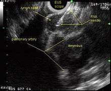 - 1 2 3 Micames CG, McCrory DC, Pavey DA, Jowell PS, Gress FG (February 2007). "Endoscopic ultrasound-guided fine-needle aspiration for non-small cell lung cancer staging: A systematic review and metaanalysis". Chest. 131 (2): 539–48. doi:10.1378/chest.06-1437. PMID 17296659.