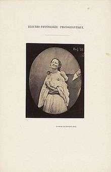 Duchenne was convinced that the "truth" of his pathognomic experiments could only be effectively rendered by photography, the subject's expressions being too fleeting to be drawn or painted. "Only photography," he writes, "as truthful as a mirror, could attain such desirable perfection."[6] He worked with a talented, young photographer, Adrian Tournachon, (the brother of Felix Nadar), and also taught himself the art in order to document his experiments.[7] From an art-historical point of view, the Mechanism of Human Physiognomy was the first publication on the expression of human emotions to be illustrated with actual photographs. Photography had only been invented recently, and there was a widespread belief that this was a medium that could capture the "truth" of any situation in a way that other mediums were unable to do.